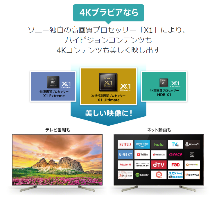 4K映像はフルハイビジョンの4倍、約829万画素の高解像度。大画面で見ても細部まで高精細(キメ細やか)な画質を実現し、フルハイビジョンでは表現しきれなかった質感やディテールまでリアルに再現します。
