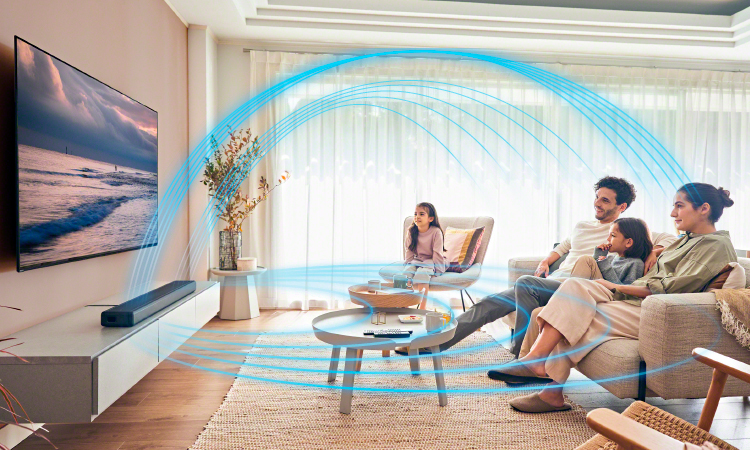 バースピーカーの左右にイネーブルドスピーカーを搭載。天井に音を反射させることでオーバーヘッドサウンドを実現、天井にスピーカーを設置することなく3次元の立体音響が可能です。