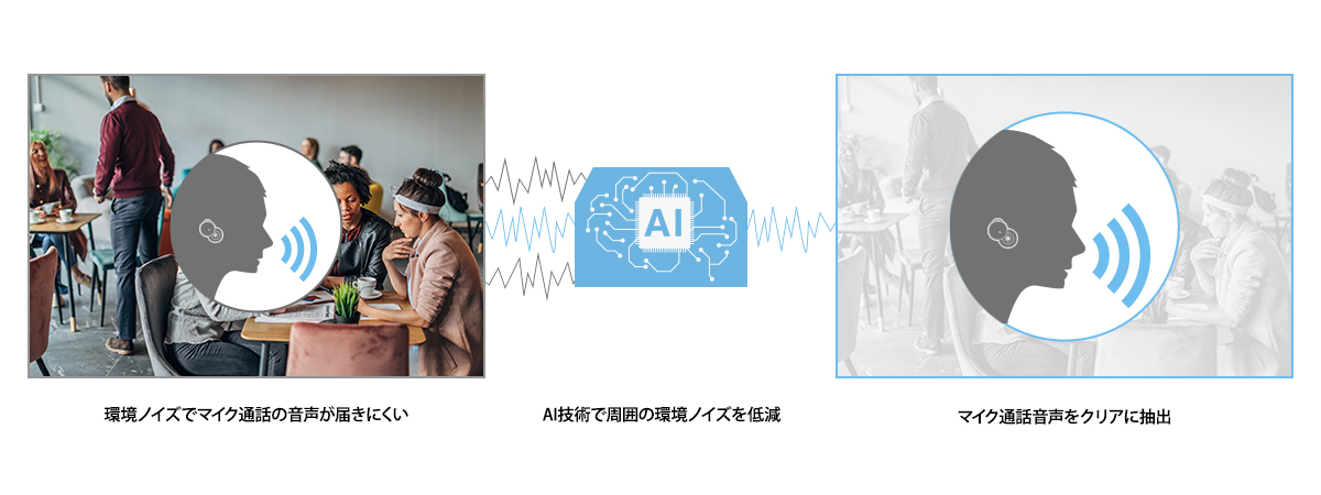 AI技術による環境ノイズ低減機能により、装着者の声だけを拾うアルゴリズム「高精度ボイスピックアップテクノロジー」を搭載。