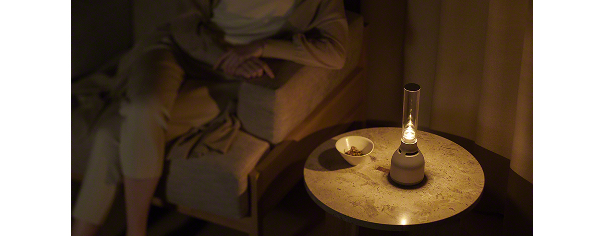 360度に広がる有機ガラスによるリアルかつクリアな音とキャンドルのようなゆらぎ、音楽と連動できるライトによりインテリア+スピーカーとしてお部屋のどこでも使えるのが特徴です。