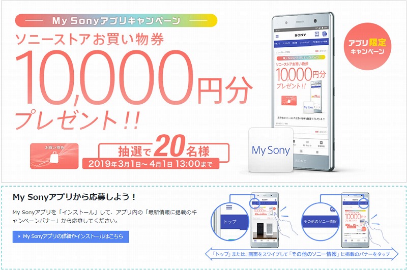 このキャンペーンはスマートフォン向けMy Sonyアプリをインストールした方の中から抽選で10,000円分のソニーストアお買い物券をプレゼントするという内容のものです。