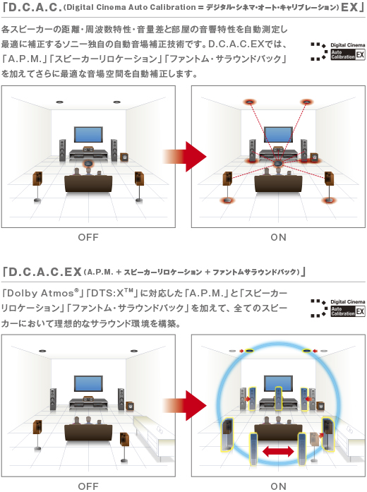 本来、理想的な5.1ch環境を作るにはスピーカーの置く場所や角度まで決まっていて補正なしの状態では中心を合わせることすら難しいのですが、最近のAVアンプには補正技術が搭載されていて【D.C.A.C.(デジタル・シネマ・オート・キャリブレーション】強力な位置補正ができ理想的なリスニング環境を作ることができます。