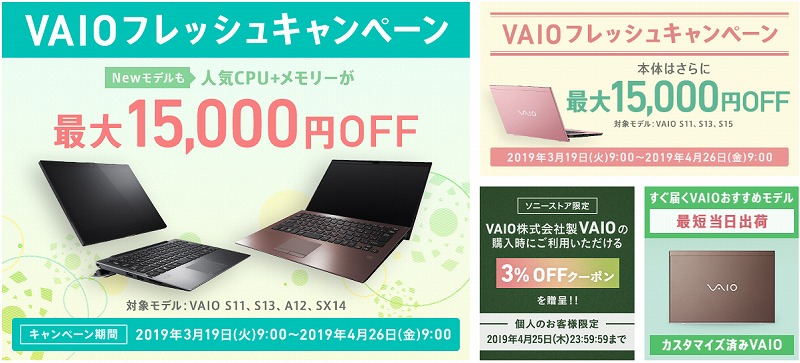 最新モデル「A12,SX14」を含むVAIO「S11,S13,A12,SX14」の人気カスタマイズパーツが最大15,000円OFFとなっています!