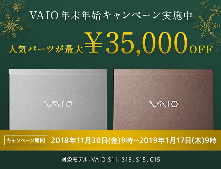 年末キャンペーンが開始されています。今回はVAIOカスタマイズモデルの高性能パーツが割引となっており最新パーツをお買い得価格で入手することが可能なキャンペーンとなっています。