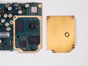 筐体と基盤の間に金メッキを施した無酸素銅切削ブロック(純度99.96%)