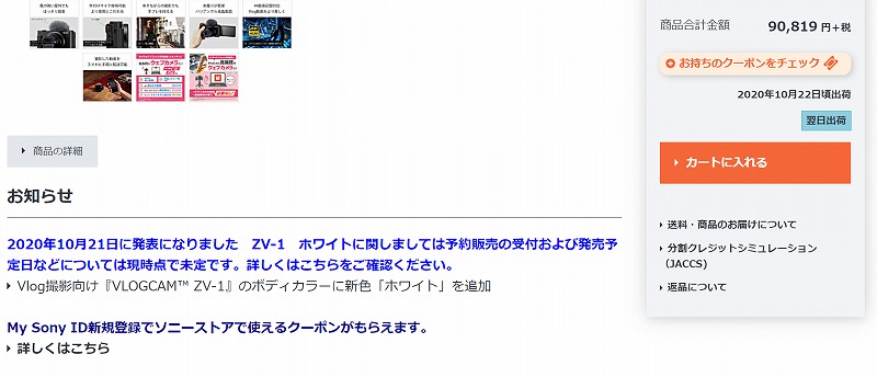 「ZV-1」ホワイトの予約開始は現時点では未定とのこと、続報をお待ち下さい。